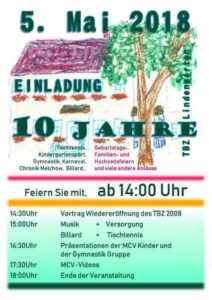 Das 10 jährige Jubiläum der Wiedereröffnung des Touristischen Begegnungszentrums Melchow und seiner ebenfalls 10-jährigen Nutzer wird am 05.05.2018 ab 14.00Uhr im TBZ Melchow gefeiert.